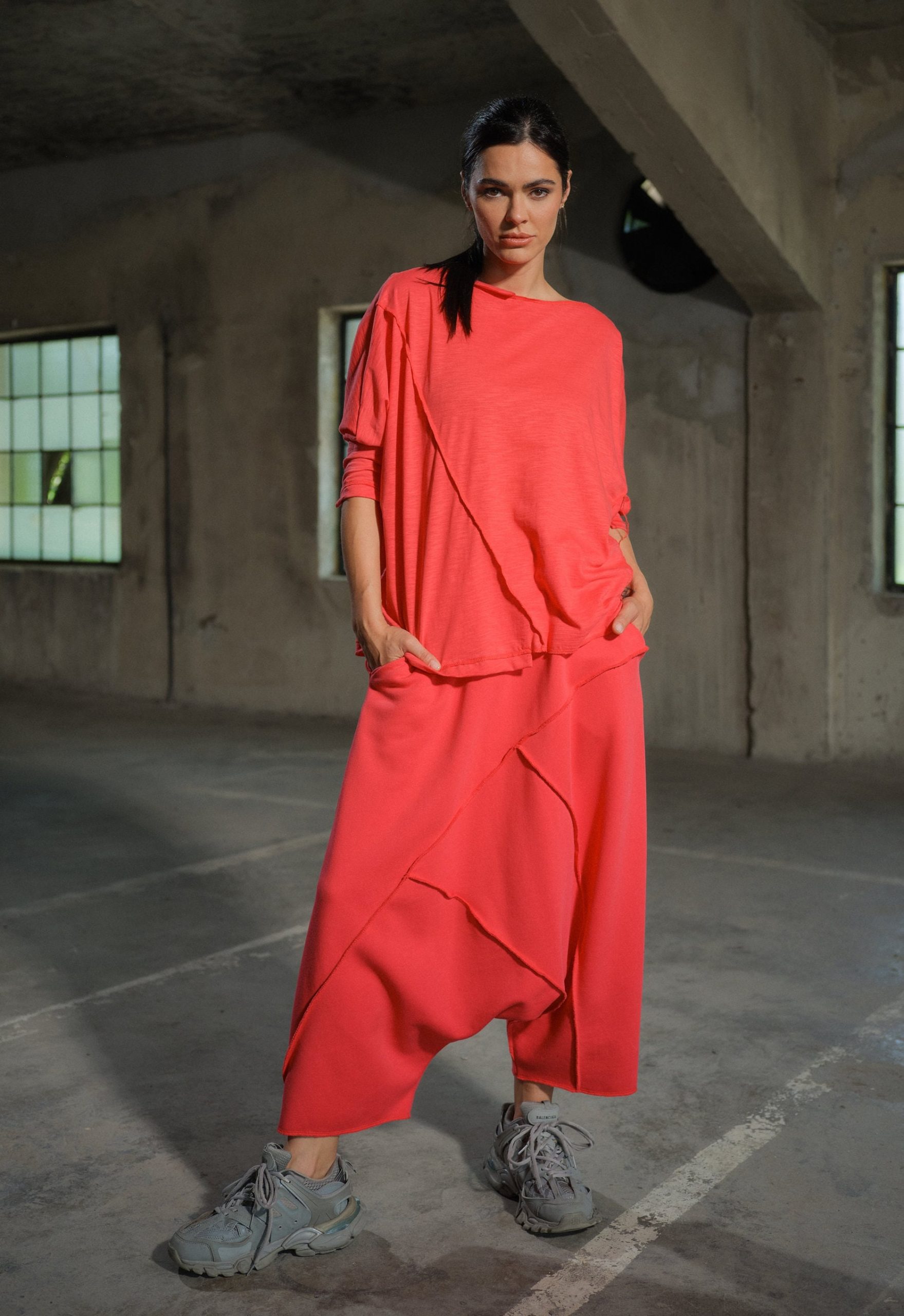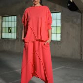 Handmade from high-quality viscose and elastane fabric, this lightweight, breathable blouse drapes beautifully over the body. Featuring a flowy asymmetrical cut, geometric accents, and short sleeves, it’s an effortless statement piece that pairs perfectly with the structured look of the pants.