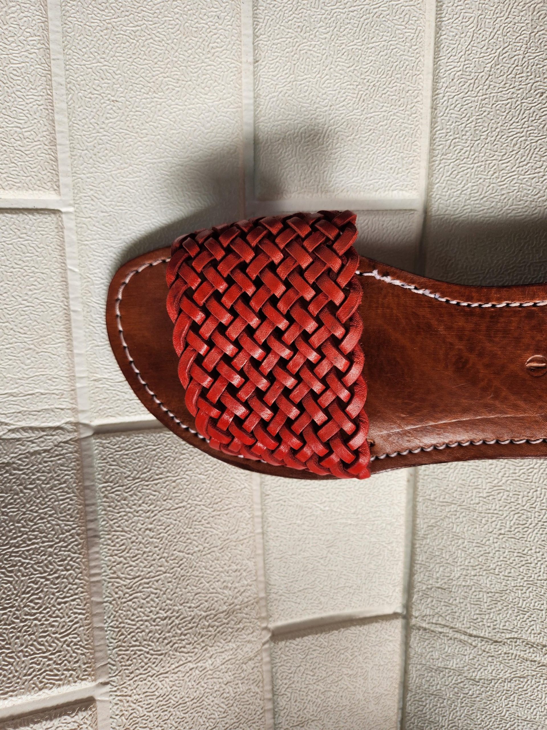 These braided slide flats feature a bold terracotta-red leather upper, tightly woven for a secure and breathable fit. The natural brown leather sole is soft, sturdy, and perfectly stitched — ideal for warm-weather days, vacation strolls, or simply feeling grounded in artisan-made quality.